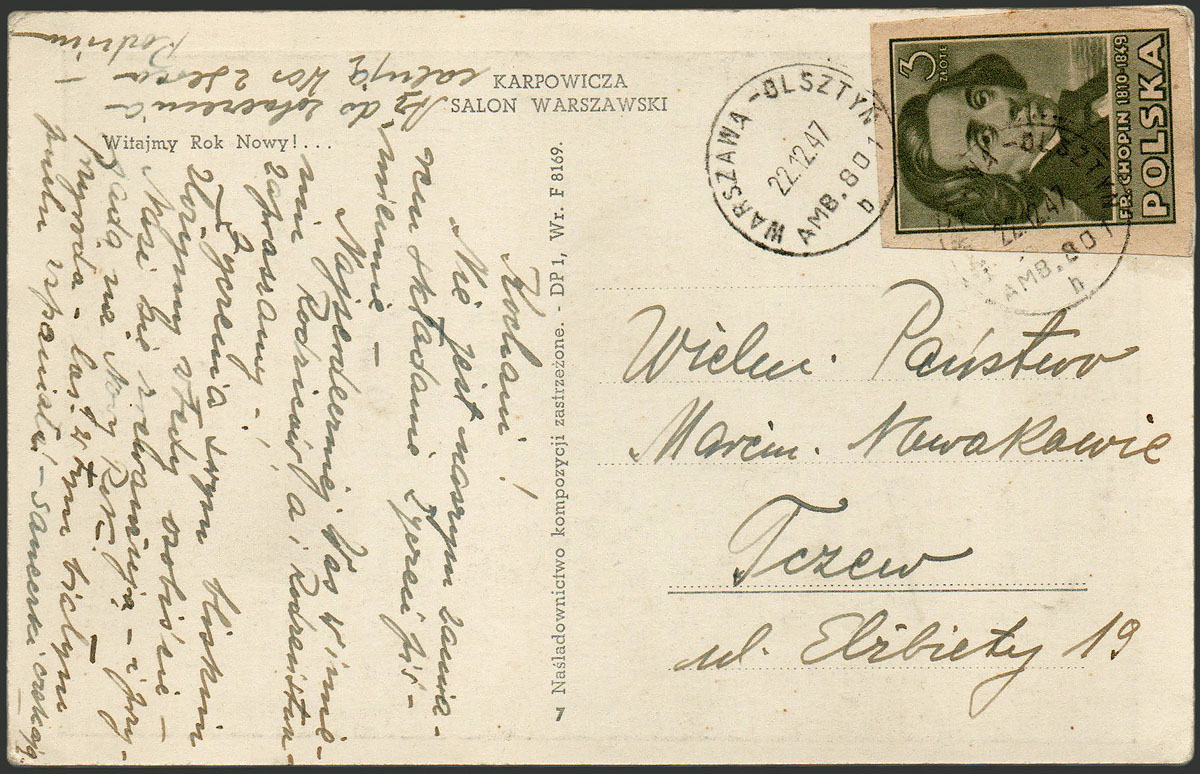 1947 widokówka do Tczewa nadana w ambulansie kolejowym na trasie Warszawa – Olsztyn nr 801. | Fi.431A |