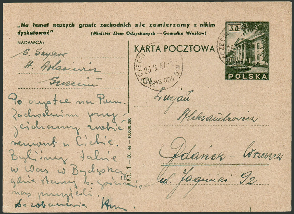 1947 kartka do Gdańska nadana w ambulansie kolejowym na trasie Szczecin – Kostrzyn nad odrą nr 904. | Fi.Cp96 |