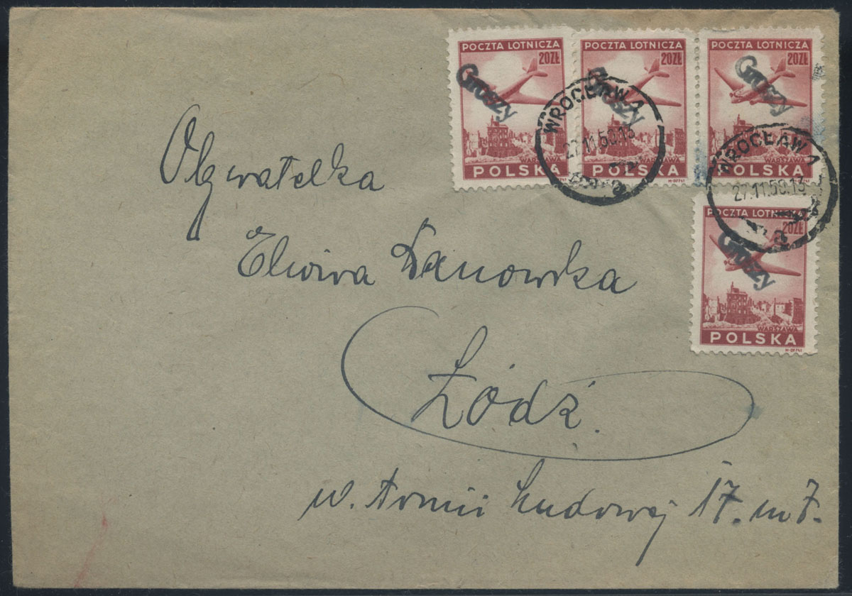 1950 groszy, list z Wrocławia do Łodzi opłacony znaczkami z nadrukiem groszy typ 26 w barwie czarnej. | Fi.398 |