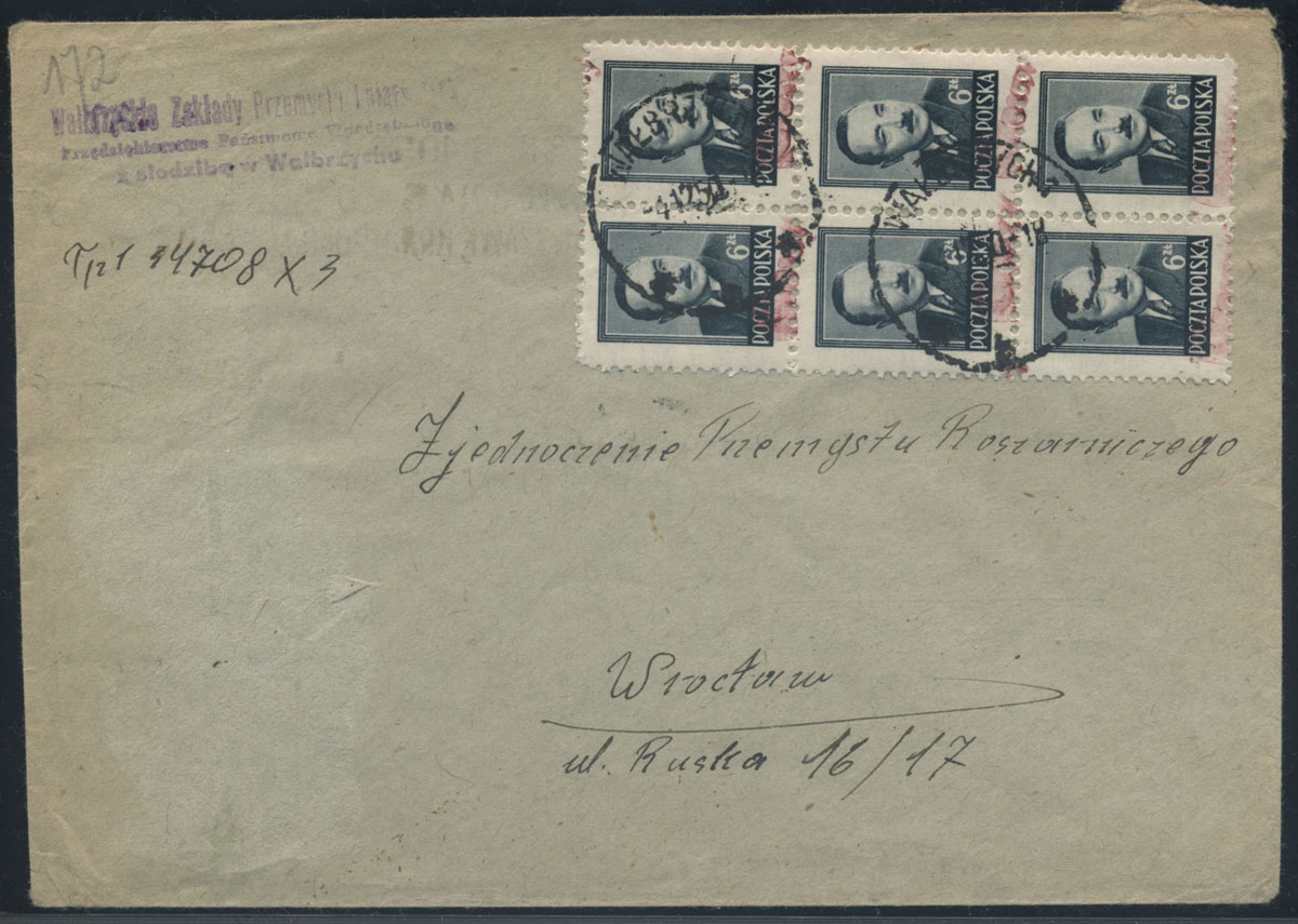 1950 "groszy" znaczki z różowoczerwonym nadrukiem typu 26, sześcioblok na liście wysłanym 6.2.1951 z miejscowości Świdnica Śląska do Warszawy; całość w bardzo dobrym stanie zachowania; dodatkowo wyraźna odbitka stempla propagandowego "Żądamy zakazu broni atomowej ..." (Myślicki 50 204); walor w bardzo dobrym stanie zachowania pochodzący z historycznej kolekcji A.Roszkowskiego z jego gwarancją. | Fi.474 Mi.625 |