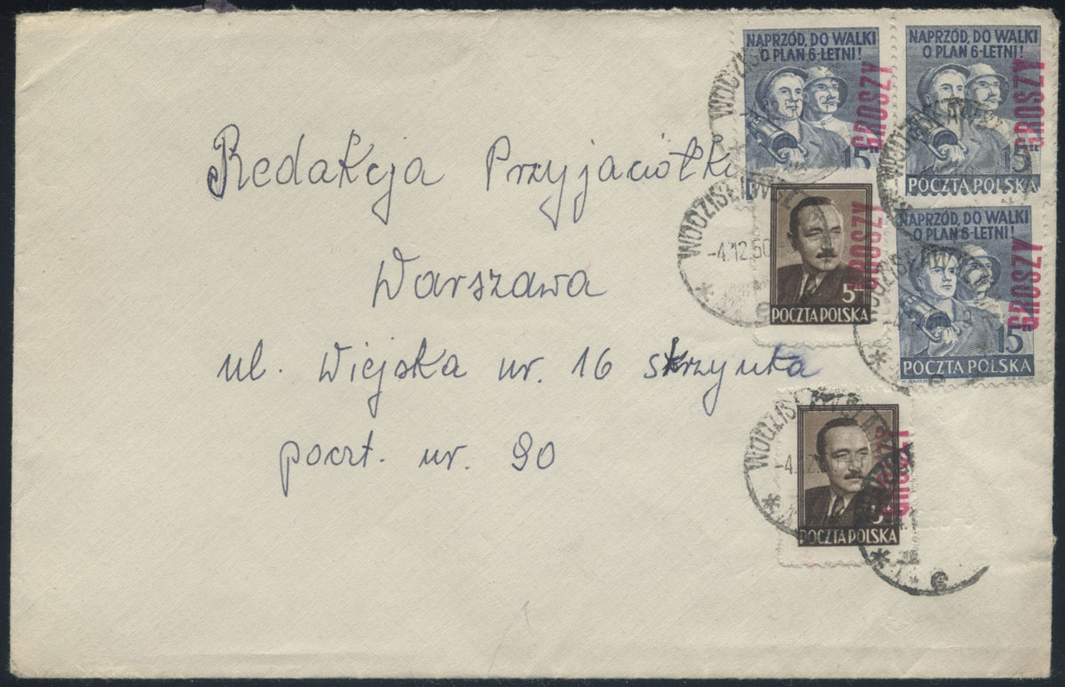 1950 groszy, miejscowy list z Warszawy opłacony znaczkami z nadrukiem groszy typ 24 w kolorze fioletowym. | Fi.474, 513, 527 Mi.625, 659, 665 |