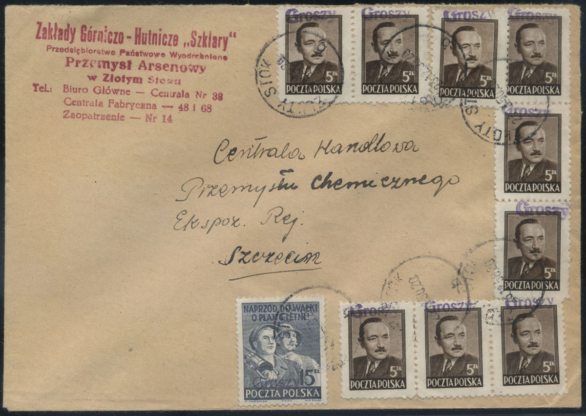 1950 groszy, list z Złotego Stoku do Szczecina opłacony znaczkami z nadrukiem groszy typ 8 w barwie fioletowej. | Fi.472, 527 |
