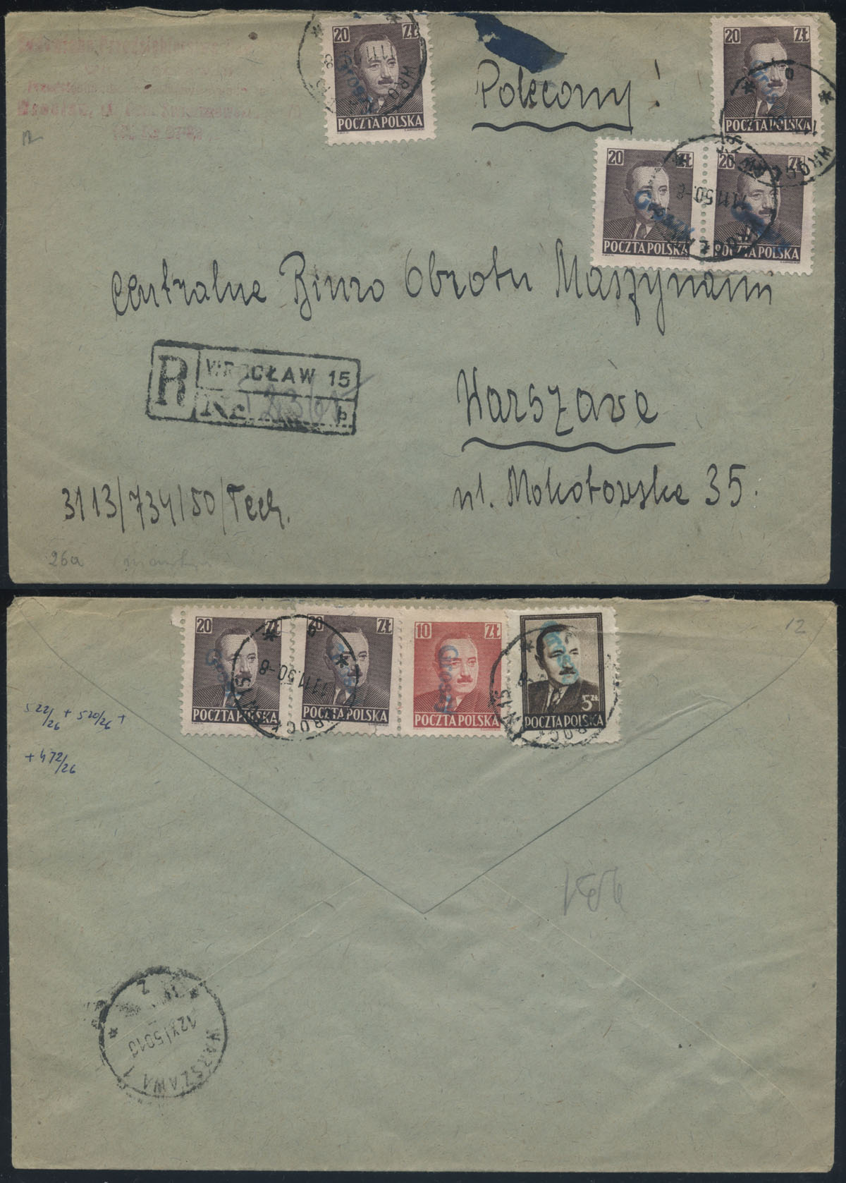 1950 groszy, list polecony z Wrocławia 15 do Warszawy opłacony znaczkami z nadrukiem groszy typ 26 w barwie niebieskiej. | Fi.472, 520, 522 |