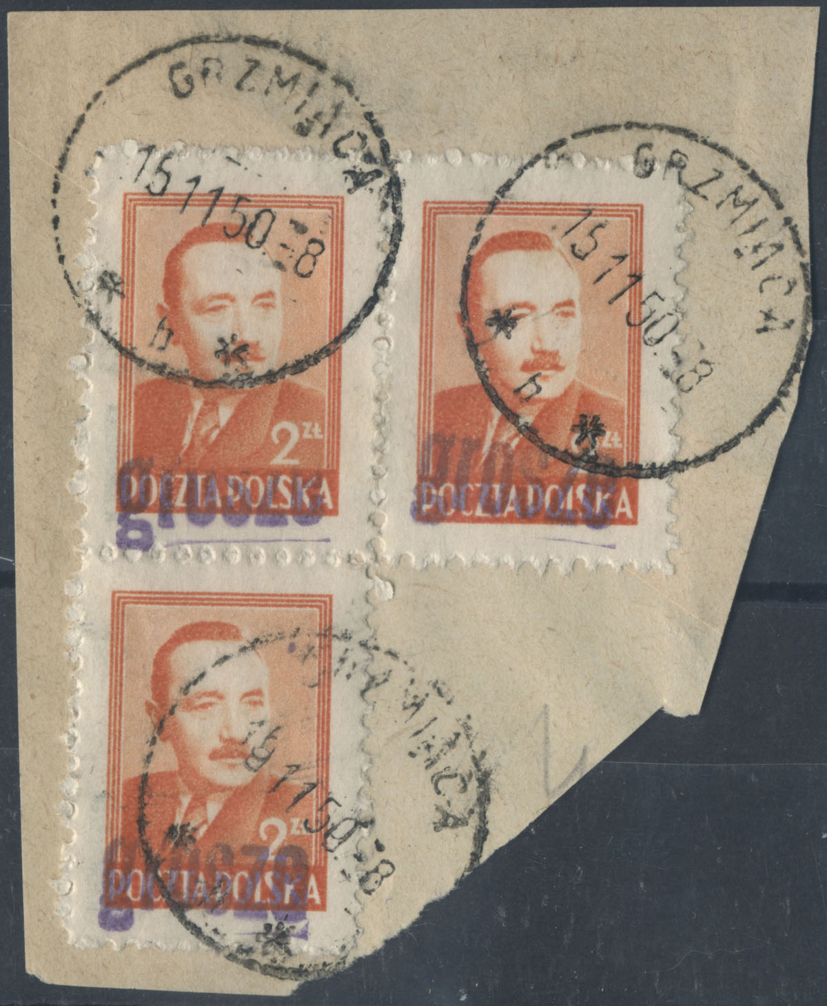 1950 groszy, stemplowane znaczki na wycinku listu z Grzmiąca z nadrukiem groszy typ 22 w barwie fioletowej, gwarancja i oznaczenie Jendroszek. | Fi.470 |