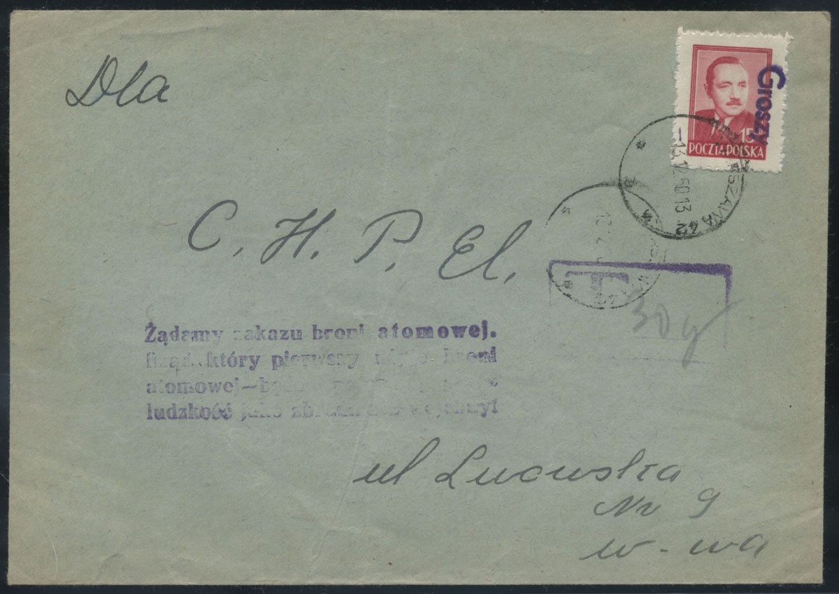1950 groszy, list z Chełmna do Warszawy opłacony znaczkami z nadrukiem groszy typ 2 w barwie fioletowej. | Fi.475 |