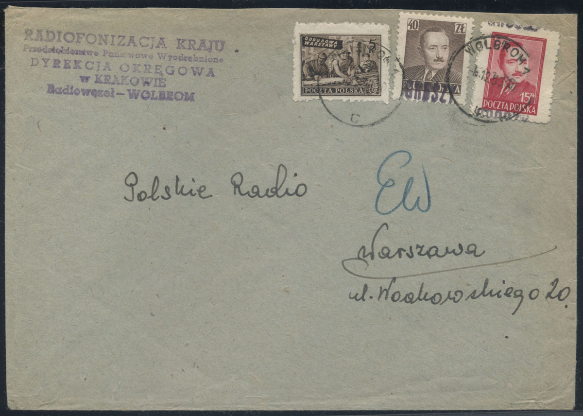 1950 groszy, list z Wolbromia do Warszawy opłacony znaczkami z nadrukiem groszy typ 3 w barwie fioletowej. | Fi.475, 513, 525 |