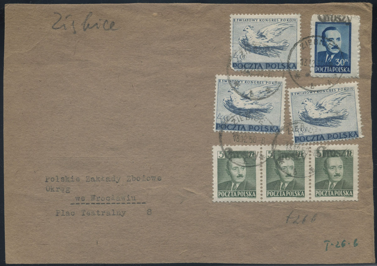 1950 groszy, front listu z Ziębic do Wrocławia opłacony znaczkami z nadrukiem groszy typ 26 w barwie czarnej. | Fi.477, 519, 530 |
