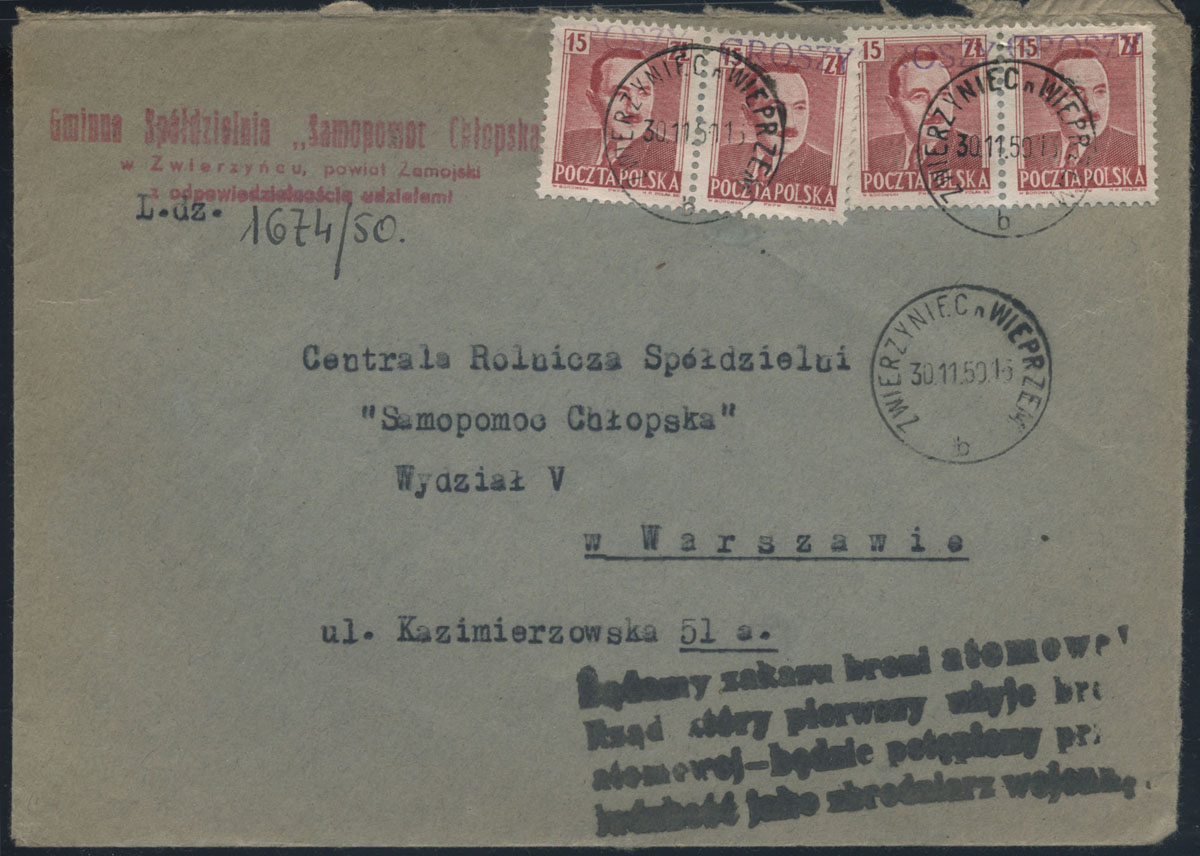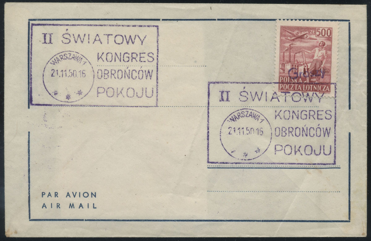1950 "groszy" mieszana frankatura ze znaczkiem w nowej walucie, list z Łodzi wysłany 5.XII do Warszawy opłacony znaczkiem z fioletowym stempelkiem typu 5; znaczki skasowane wirnikiem propagandowym "POMOC ZSRR, PRZYKŁAD ZSRR PRZYJAŹŃ Z ZSRR - GWARANCJĄ WYKONANIA NASZEGO PLANU 6-LETNIEGO" (Myślicki 50 152); na odwrocie odbitka stempla propagandowego "Żądamy zakazu broni atomowej ..." (Myślicki 50 203). | Fi.503, 531II Mi.644, 669I |