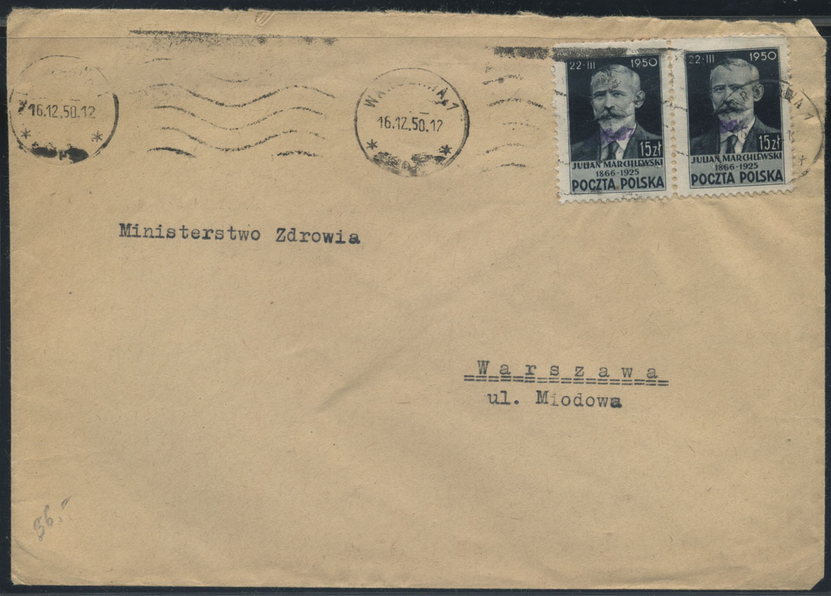 1950 25. rocznica śmierci Juliana Marchlewskiego - frankatura pojedyncza, opłacony zgodnie z taryfą list wysłany 8.4 z Warszawy do Wrzeszcza; bardzo dobry stan zachowania. | Fi.512 Mi.440 |