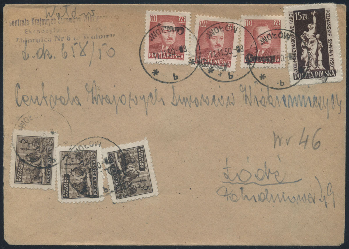 1950 groszy, list z Wołowa do Łodzi opłacony znaczkami z nadrukiem groszy typ 26 w barwie czarnej. | Fi.513, 516, 520 |