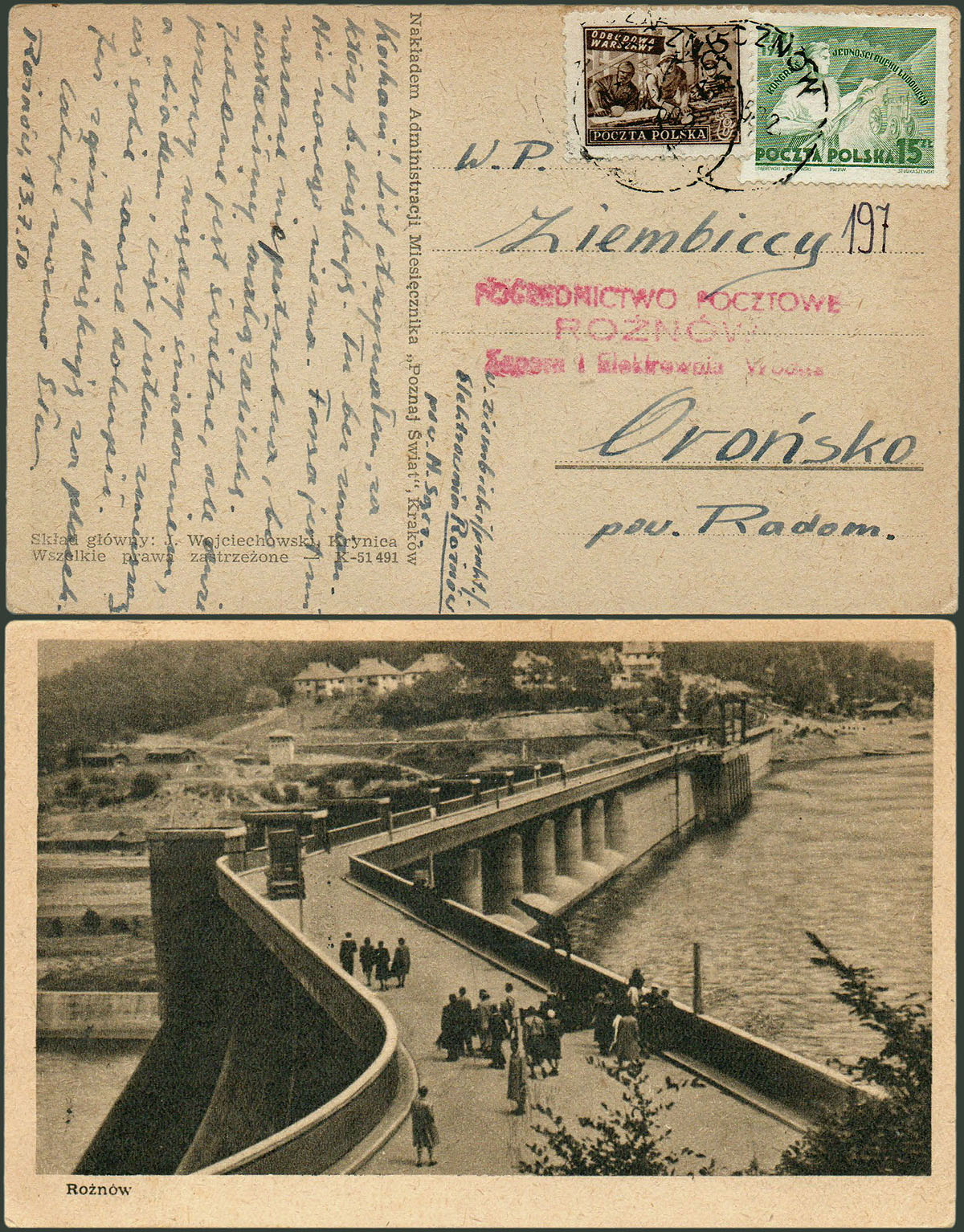 1950 pośrednictwo pocztowe ROŻNÓW, widokówka (Zapora w Rożnowie) wysłana do Orońska, dodatkowy stempel w kolorze czerwonym "POŚREDNICTWO POCZTOWE / ROŻNÓW / Zapora i Elektrownia Wodna". | Fi.503, 513 |