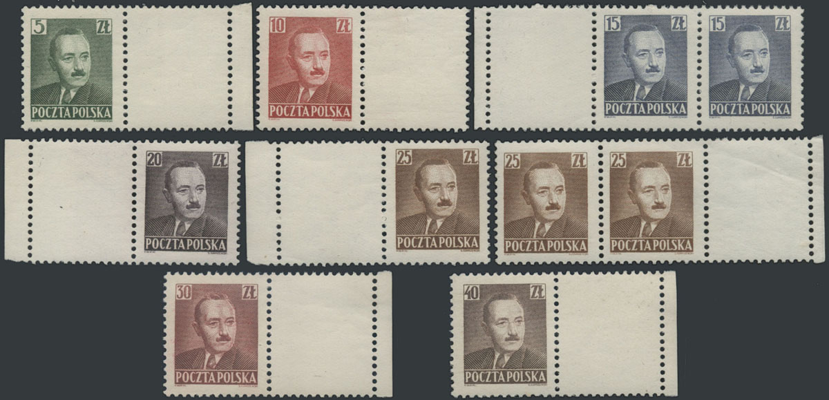 1950 Bolesław Bierut, zestaw znaczków z pustopolami. Katalog Fischera wykazuje całą serię z pustopolami, jednakże podręcznik Kiełbasy nie potwierdza istnienia pustopoli na ostatniej wartości wydania tj. Fi 526. Za to wyróżnia on pustopola z lewej i prawej strony znaczka. W porównaniu do podręcznika Kiełbasy w zestawie brakuje 2 najrzadszych pozycji : FI 519 z pustoopolem z lewej i Fi 520 z pustopolem z lewej. | Fi.519-25 |