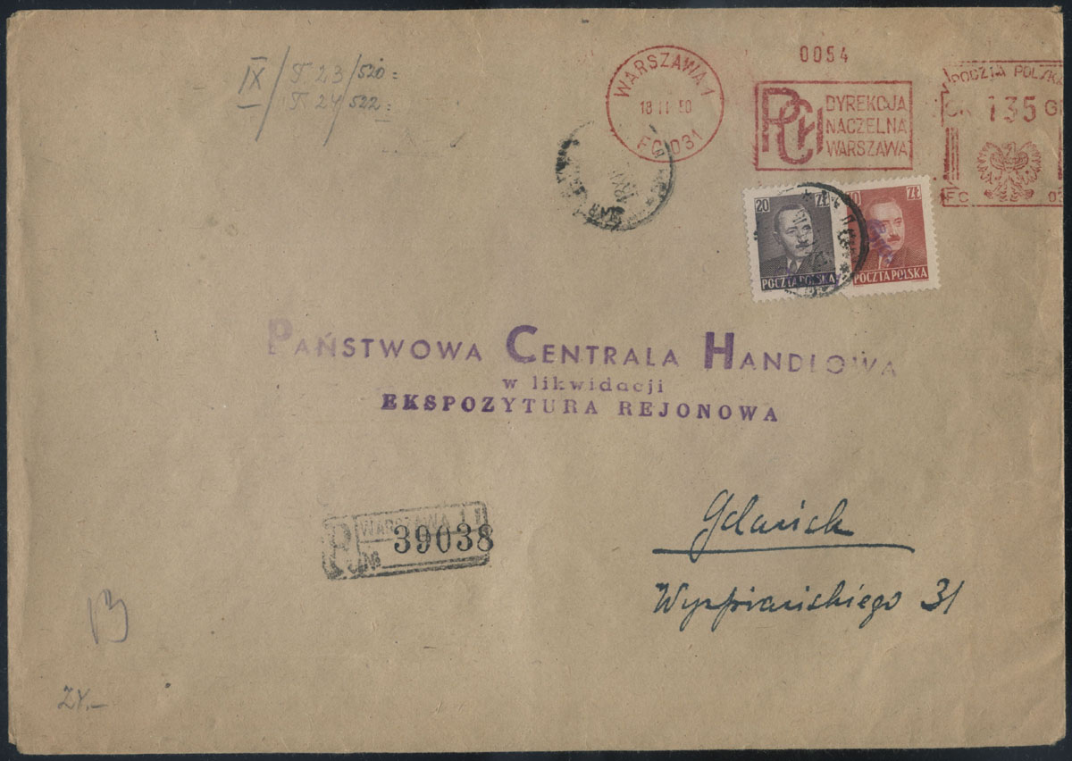 1950 groszy, duży firmowy list polecony z Warszawy do Gdańska opłacony znaczkami z nadrukiem groszy typ 24 w barwie fioletowej. | Fi.520, 522 |