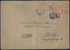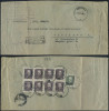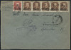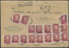 1950 groszy, firmowy list polecony z Nowego Sącza do Warszawy opłacony znaczkami z nadrukiem groszy typ 3 w kolorze czerwonym. | Fi.519, 520, 526 Mi.650, 651, 658 |