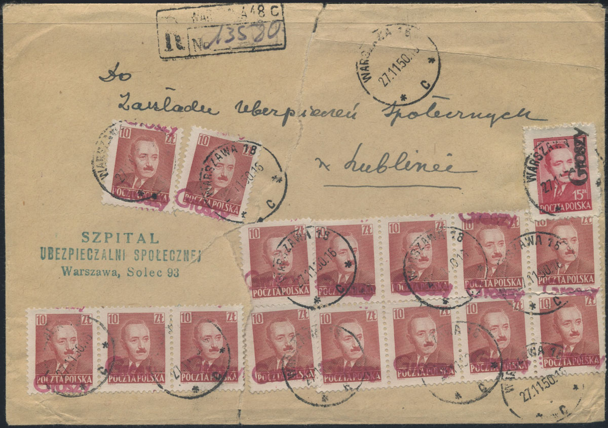1950 groszy, list polecony z Warszawy 18 do Lublina opłacony znaczkami z nadrukiem groszy typ 23 i 24 w barwie czerwonej i czarnej. | Fi.520 |