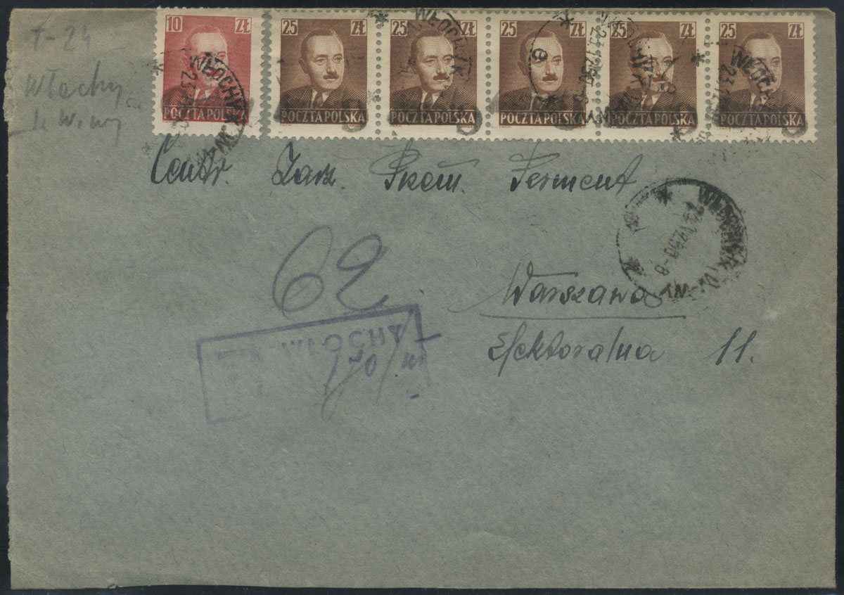 1950 groszy, list polecony z Włoch do Warszawy opłacony znaczkami z nadrukiem groszy typ 24 w barwie czarnej. | Fi.520, 523 |