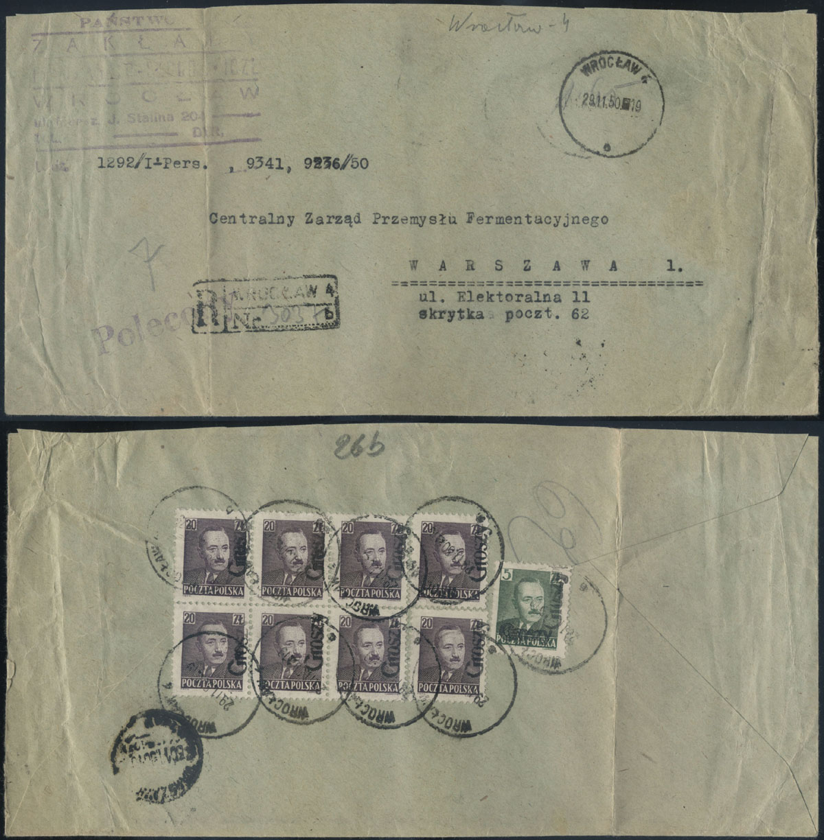 1950 groszy, list polecony z Wrocławia 4 do Warszawy opłacony znaczkami z nadrukiem groszy typ 26B w barwie czarnej. | Fi.519, 522 |