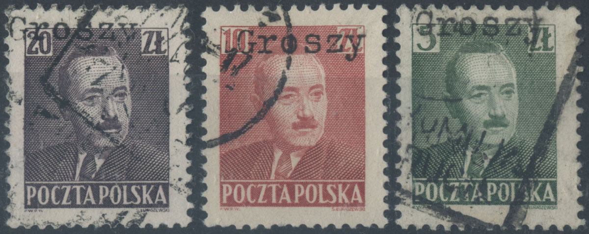 1950 groszy nadruk lokalny Rzeszów, stemplowane znaczki z nadrukiem groszy typ 35 w barwie czarnej, różne gwarancje. | Fi.519, 520, 522 |