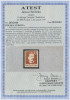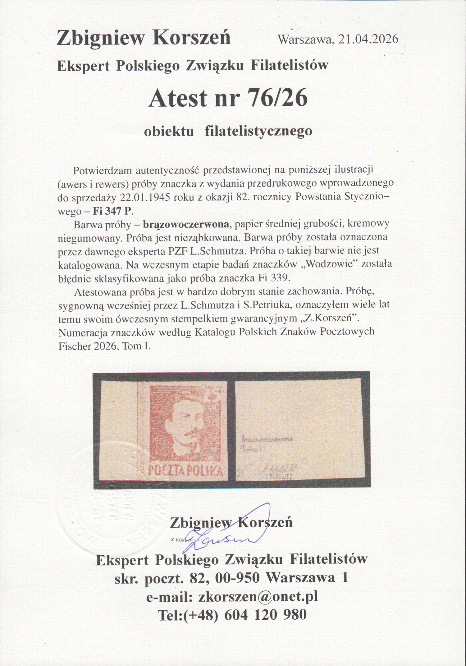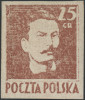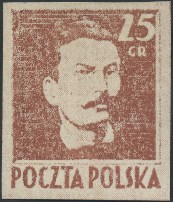 1945 82 rocznica Powstania Styczniowego - R.Traugutt, marginesowa próba znaczka za 5 zł./25 gr. poz.21 bez nadruku na kremowym satynowanym papierze; do końca XX wieku identyfikowana jako próba wodzów, a od dwudziestu pięciu lat - po badaniach i publikacjach H.Monkosa i L.Schmutza "Filatelistyka" 6/98, jako próba nakładu wznowionego; ma unikalny kolor brązowoczerwony i nie została dotąd skatalogowana; próby w trzech znanych dotąd barwach (Fi.5500.-), znaczki bez nadruku w barwach definitywnych (ząbkowane) katalogowane są jako makulatura MK3 i nieco wyżej wyceniane (Fi.6500.-); gwarancja i dawny opis Schmutz, gwarancja i stary fotoatest Petriuk BPP, gwarancja i nowy fotoatest. | Fi.347 P(4) Mi.389 |