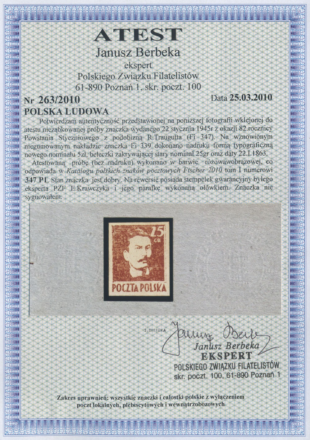 1945 82. rocznica Powstania Styczniowego, nieząbkowana próba w barwie różowawobrązowej bez nadruku, fotoatest Berbeka, gwarancja Krawczyk. | Fi.347 P1 |