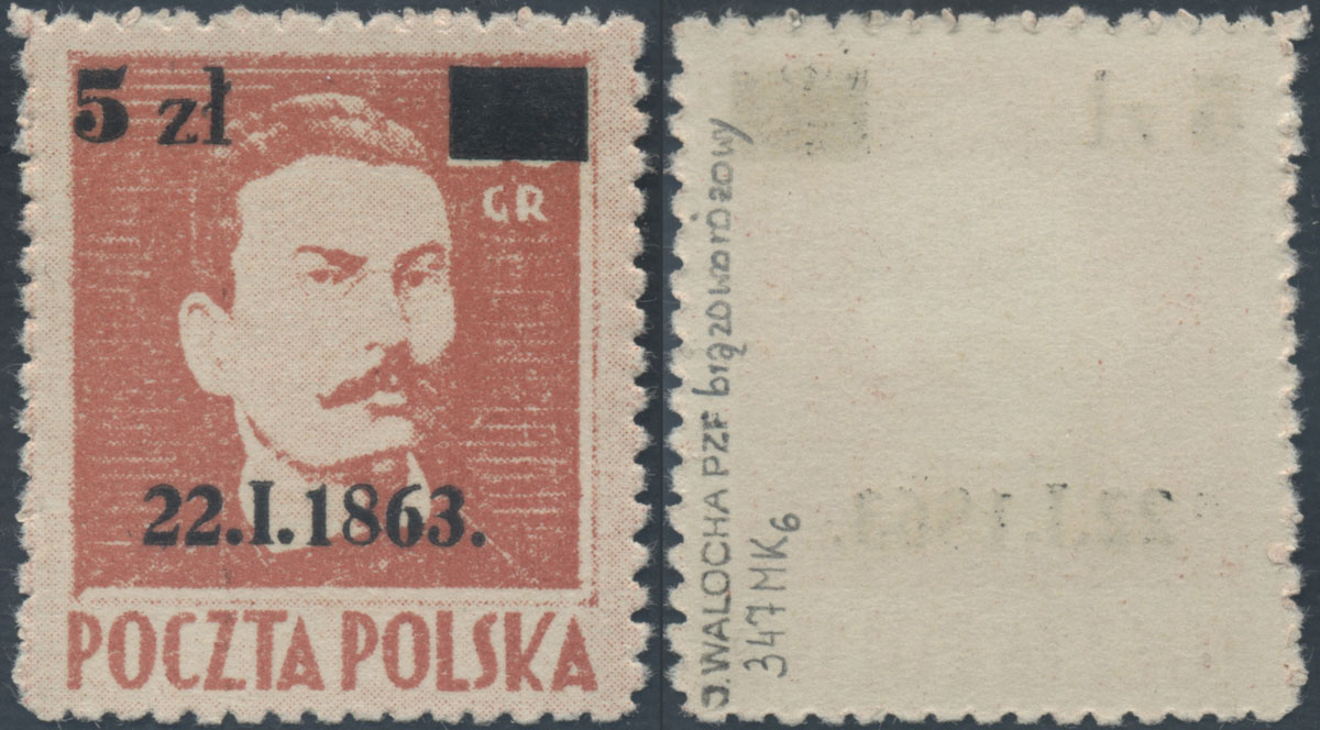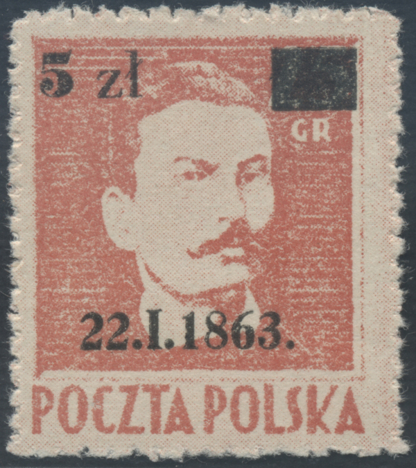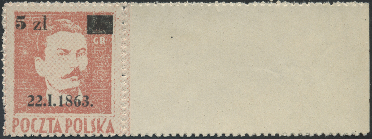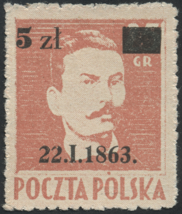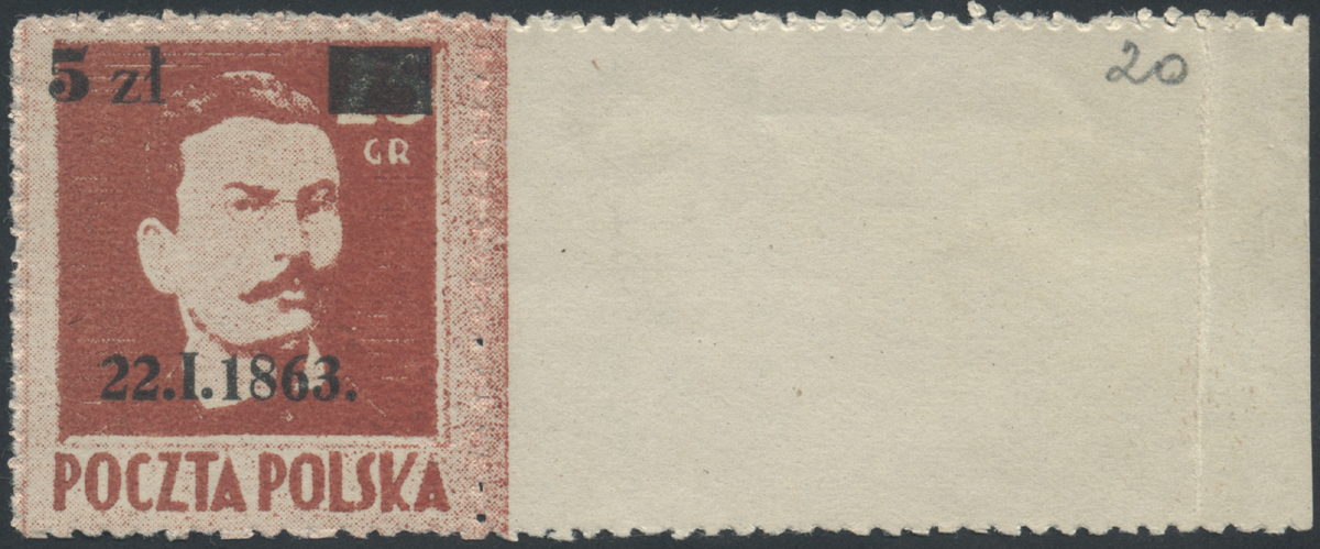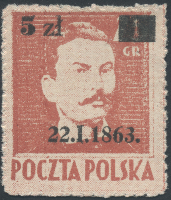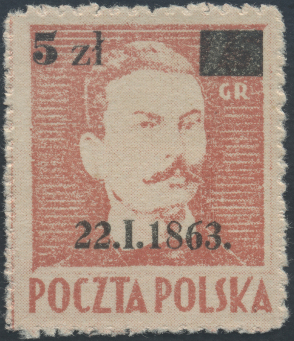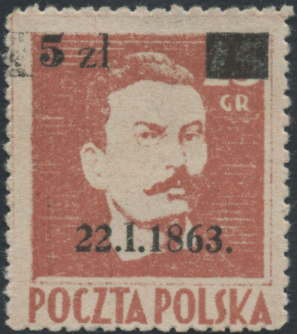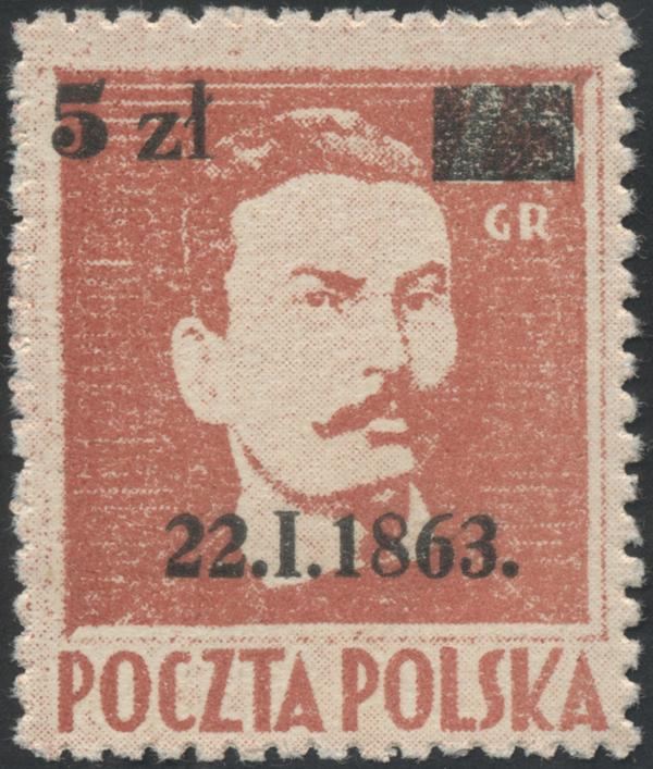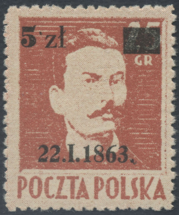 1945 Powstanie Styczniowe - R.Traugutt,, znaczek za 5 zł./25 gr. w kolorze jasno brązowaworóżwym z błędem na poz.26 występującym w części nakładu "plama obok szyi" (Fi.500.-) oraz niekatalogowanym błędem nadruku "wygięta kreska przecinająca podstawę pierwszej cyfry 2", gwarancja i opis katalogowanego błędu Walocha. | Fi.347ad B18 Mi.389 |