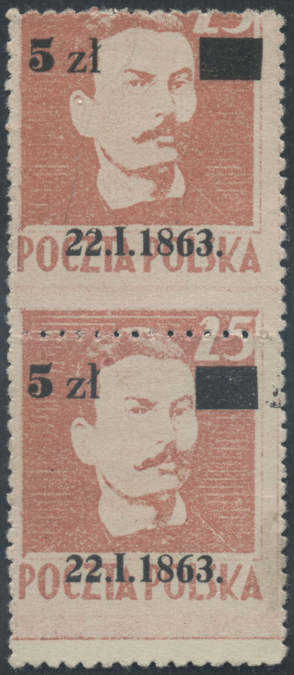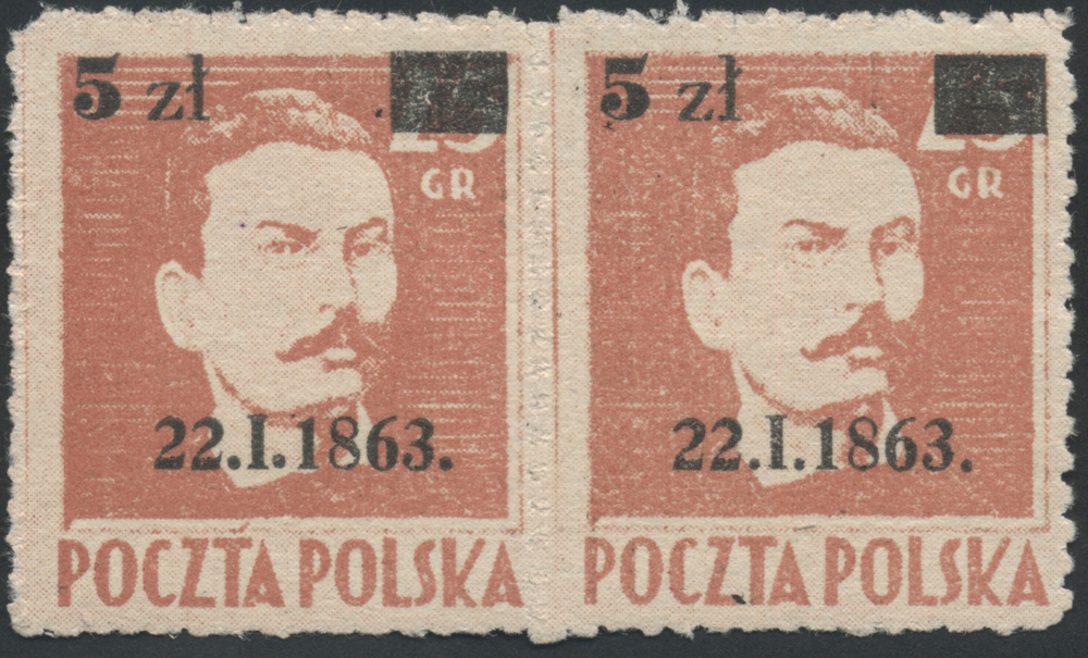 1945 82. rocznica Powstania Styczniowego, parka znaczków w barwie jasno brązowaworóżowej z silnie przesuniętą perforacją, górny znaczek z błędem "PÓLSKA", dolny z błędem "spacja na prawo od prostokąta", fotoatest Walocha. | Fi.347aa B2+B14 Mi.389 |