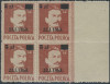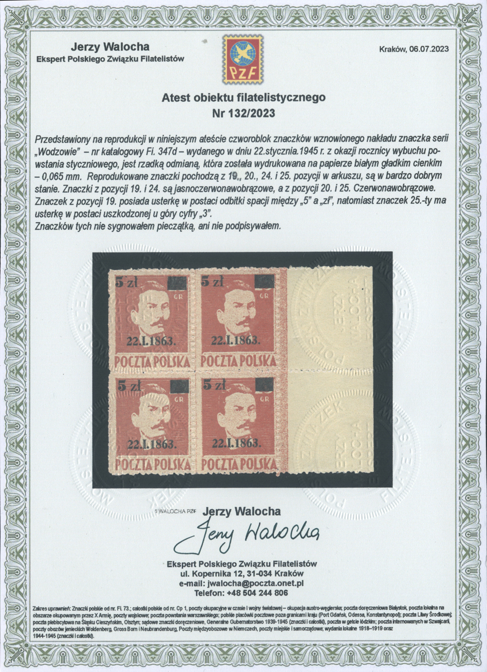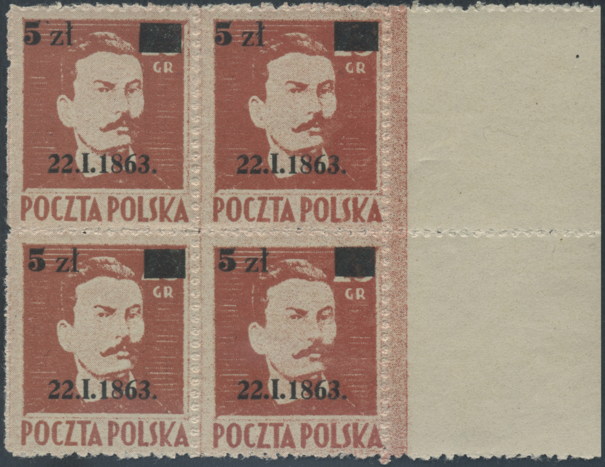 1945 82. rocznica Powstania Styczniowego, marginesowy czworoblok znaczków w barwie czerwonobrązowym (dwa w odmianie jasnej) na papierze cienkim ca 0,065, na dwóch znaczkach błędy "spacja między 5, a zł" i "przerwana cyfra 3 u góry" , fotoatest Walocha. | Fi.347d B11, B17 Mi.389 |