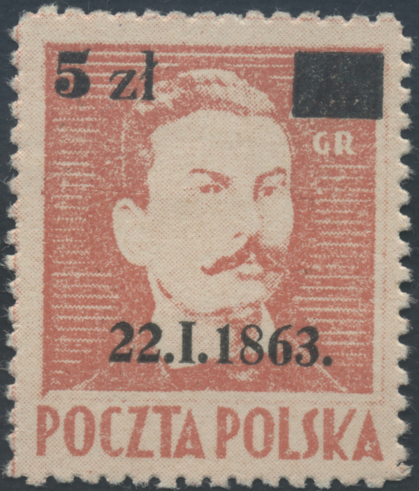 1945 82. rocznica Powstania Styczniowego, znaczek w barwie brązowaoróżowej z błędem "rozdzielony prostokąt", gwarancja i opis Berbeka. | Fi.347abB1 Mi.389 |
