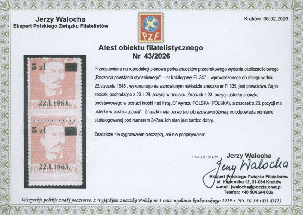 1945 82. rocznica Powstania Styczniowego, znaczek za 5 zł./25 gr. kolorze brązoworóżowym, gwarancja z opisem koloru Walocha. | Fi.347ab Mi.389 |