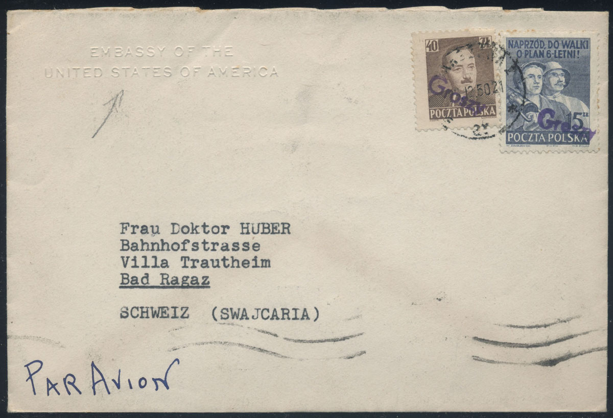 1950 groszy, list lotniczy z Warszawy do Szwajcarii opłacony znaczkami z nadrukiem groszy typ 23 w barwie fioletowej, koperta ambasady Stanów Zjednoczonych. | Fi.525, 527 |