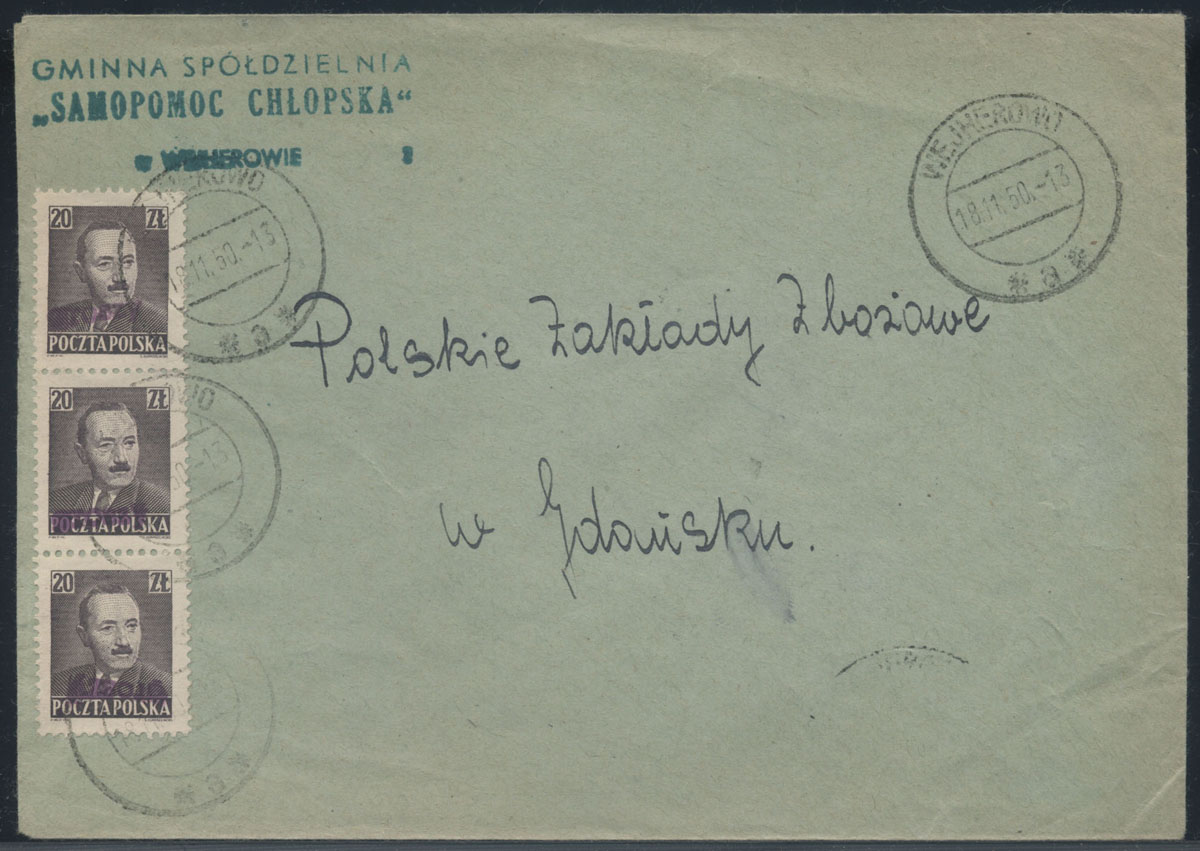 1950 groszy, duży firmowy list polecony z Chorzowa do Wrocławia opłacony znaczkami z nadrukiem groszy typ 3 w barwie fioletowej, na odwrocie stempel odbiorczy. | Fi.523 Mi.655 |