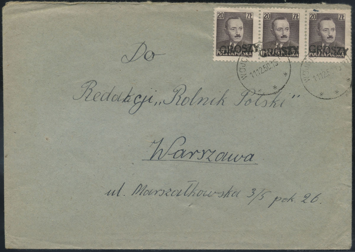 1950 groszy, list z Wojciechowic do Warszawy opłacony znaczkami z nadrukiem groszy typ 4 w barwie czarnej. | Fi.522 |