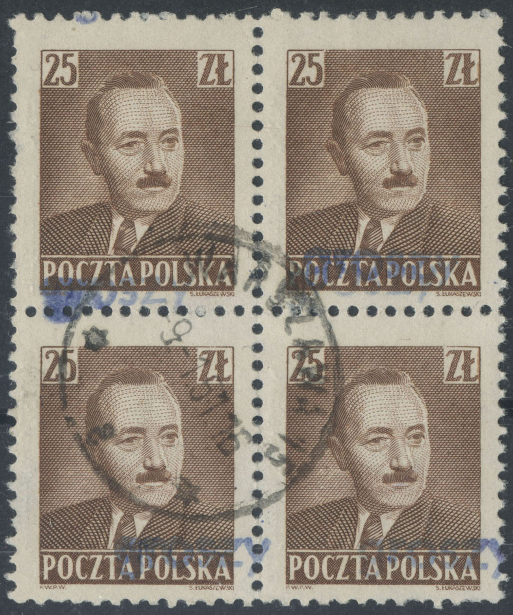 1950 groszy, stemplowane znaczki z nadrukiem groszy typ 25 w barwie niebieskiej, gwarancja i oznaczenie Weźranowski. | Fi.523 |