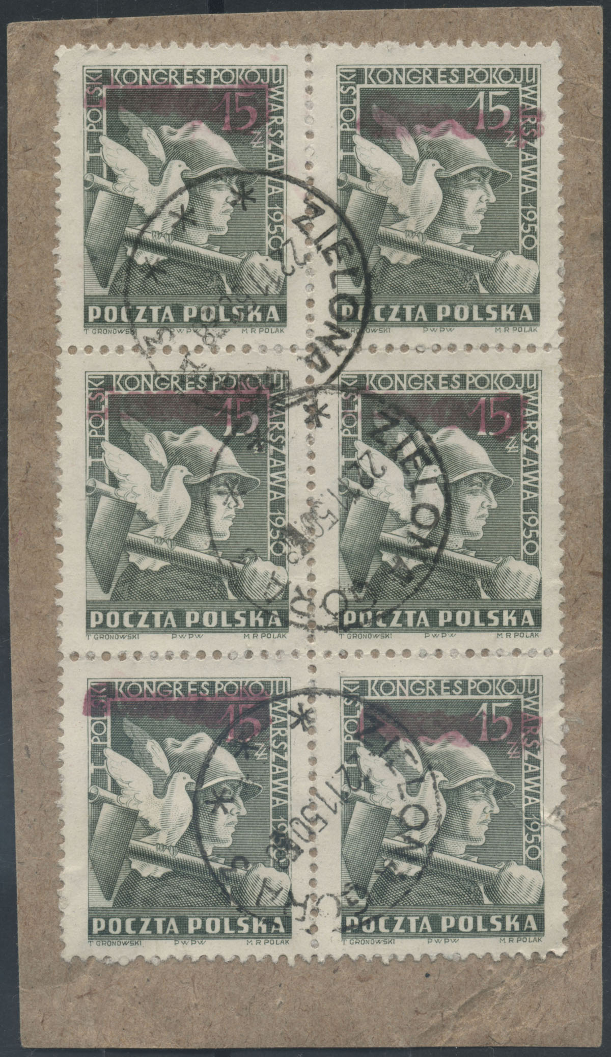 1950 "groszy - lokalny", Bielsk Podlaski, I Kongres Pokoju, czworoblok znaczków za 15 zł. z fioletowym stempelkiem typu 37, pochodzi z historycznej kolekcji A.Roszkowskiego i ma na odwrocie jego gwarancję. | Fi.529 Mi.667 |
