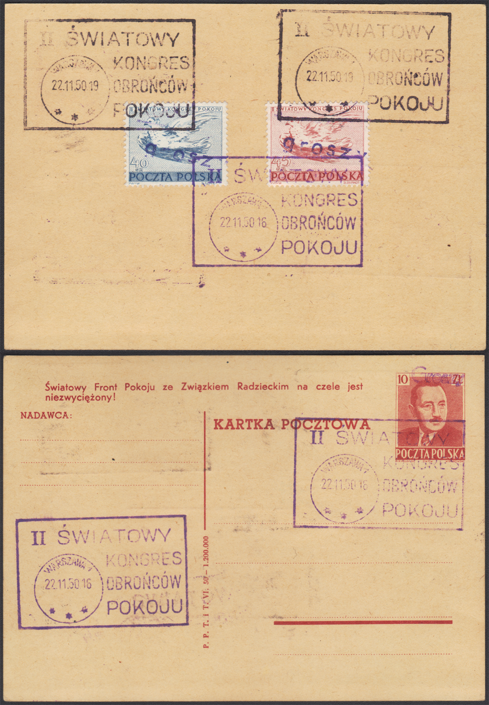 1950 "groszy" NADRUK PRYWATNY w typie nadruku 16 - o wymiarach 26x5mm - seria znaczków w nowej walucie skasowana 22.11 stemplem okolicznościowym "II ŚWIATOWY KONGRES OBROŃCÓW POKOJU" Warszawa 1 na odwrocie karty pocztowej z nadrukiem typu 23; bardzo dobry stan zachowania (Myślicki 50 088). | Fi.530, 531II; Cp124 Mi.668-69 |