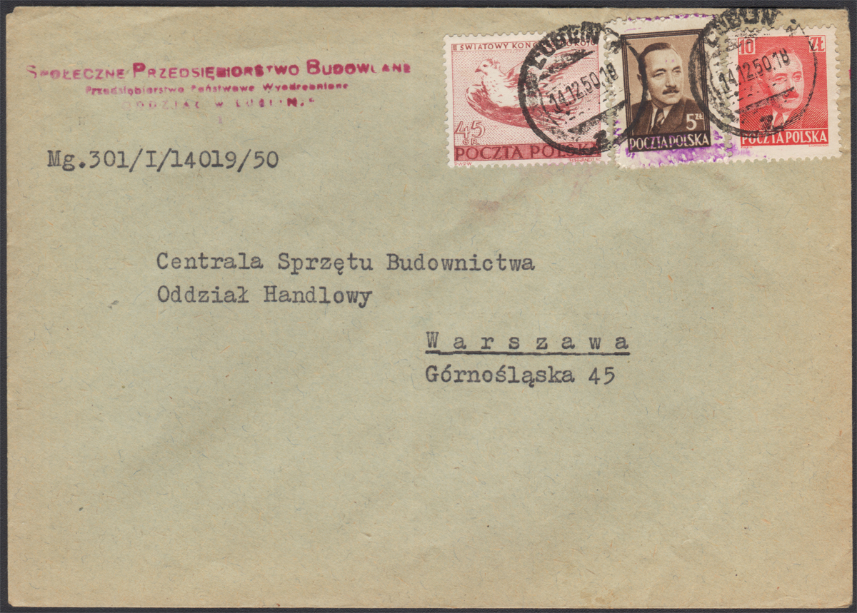 1950 groszy, list firmowy z Gliwic 20.11.50 do Warszawy, nadruki dyrekcyjne typ 3B w kolorze fioletowym. | Fi.527 Mi.665 |