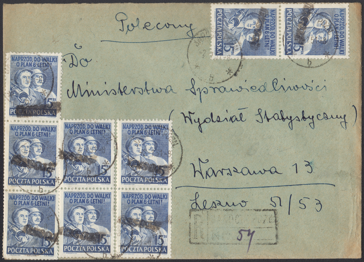 1950 groszy, list polecony z Katowic do Wrocławia opłacony znaczkiem z nadrukiem groszy typ 3 w kolorze fioletowym. | Fi.527, 530 Mi.665, 668 |