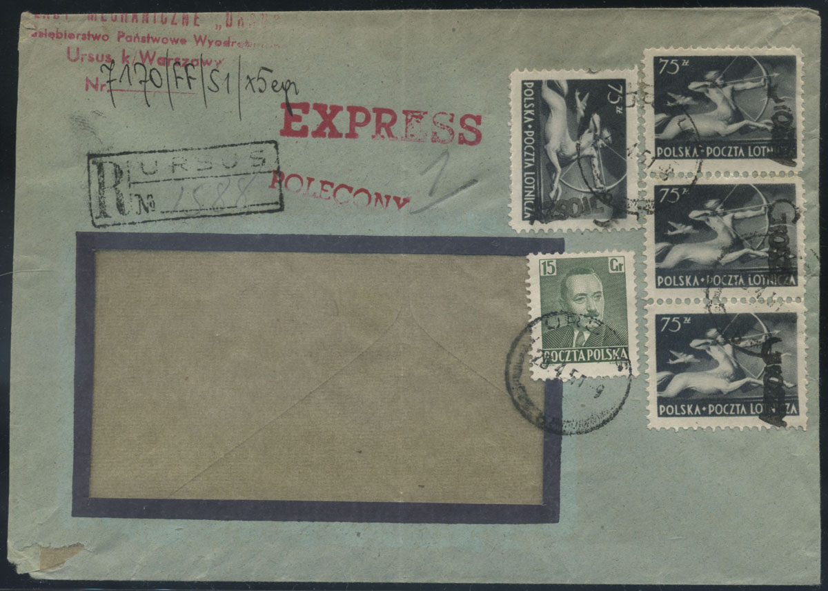 1951 groszy, list polecony z Ursusa do Warszawy opłacony znaczkami z nadrukiem groszy typ 23B w barwie czarnej. | Fi.448, 535 |