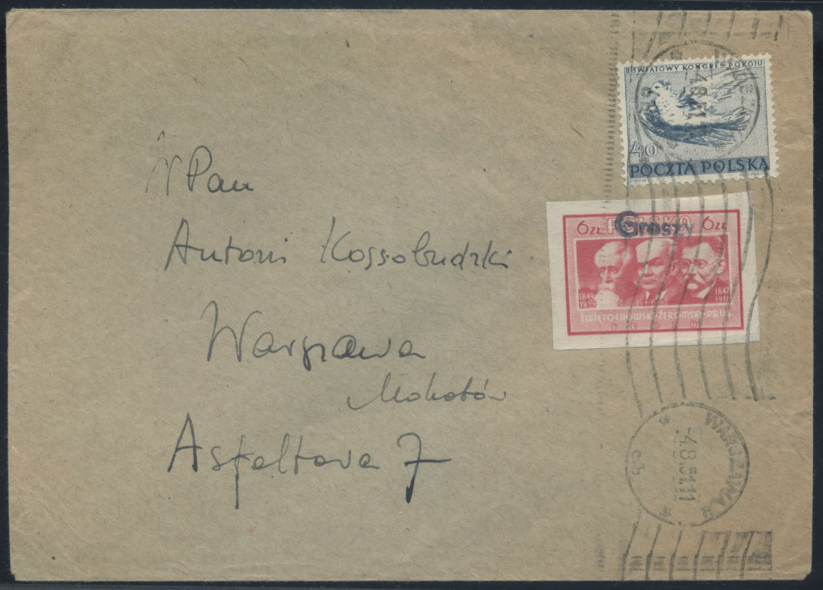 1951 groszy, list z Kamiennej Góry do Warszawy opłacony znaczkami z nadrukiem groszy typ 26 w barwie czerwonej. | Fi.446 Mi.587 |