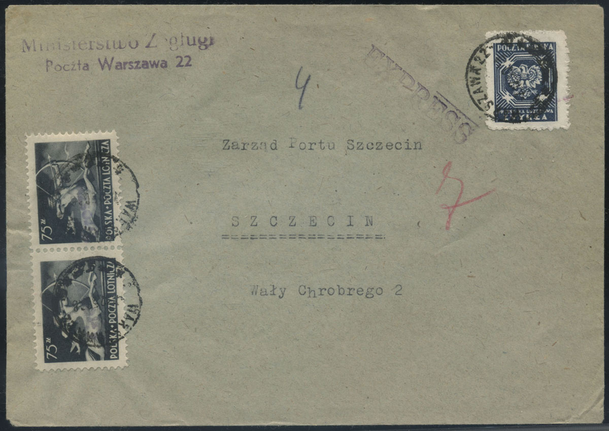 1951 groszy, urzędowy list ekspresowy z Warszawy 22 do Szczecina opłacony znaczkami z nadrukiem groszy typ 25 w barwie fioletowej. | Fi.448 |