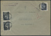 1951 groszy, list polecony z Świdnicy do Warszawy opłacony znaczkami z nadrukiem groszy typ 26 w barwie fioletowej i niebieskiej. | Fi.449, 472, 527 Mi.590, 623, 665 |