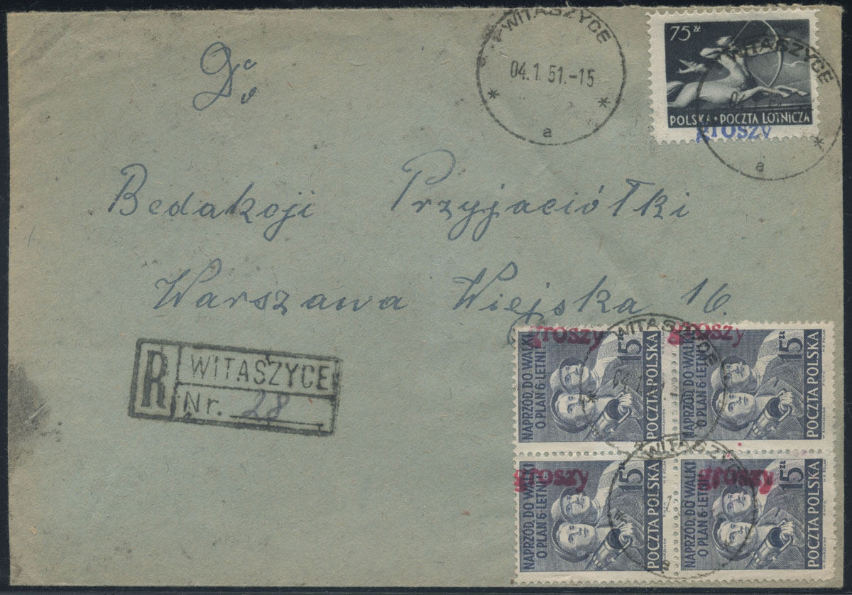 1951 groszy, list polecony z Witaszyc do Warszawy opłacony znaczkami z nadrukiem groszy typ 17 w barwie czerwonej i niebieskiej. | Fi.448, 527 |