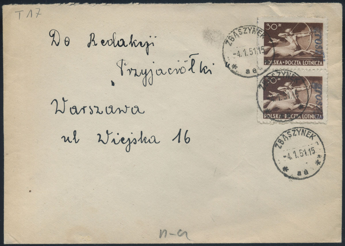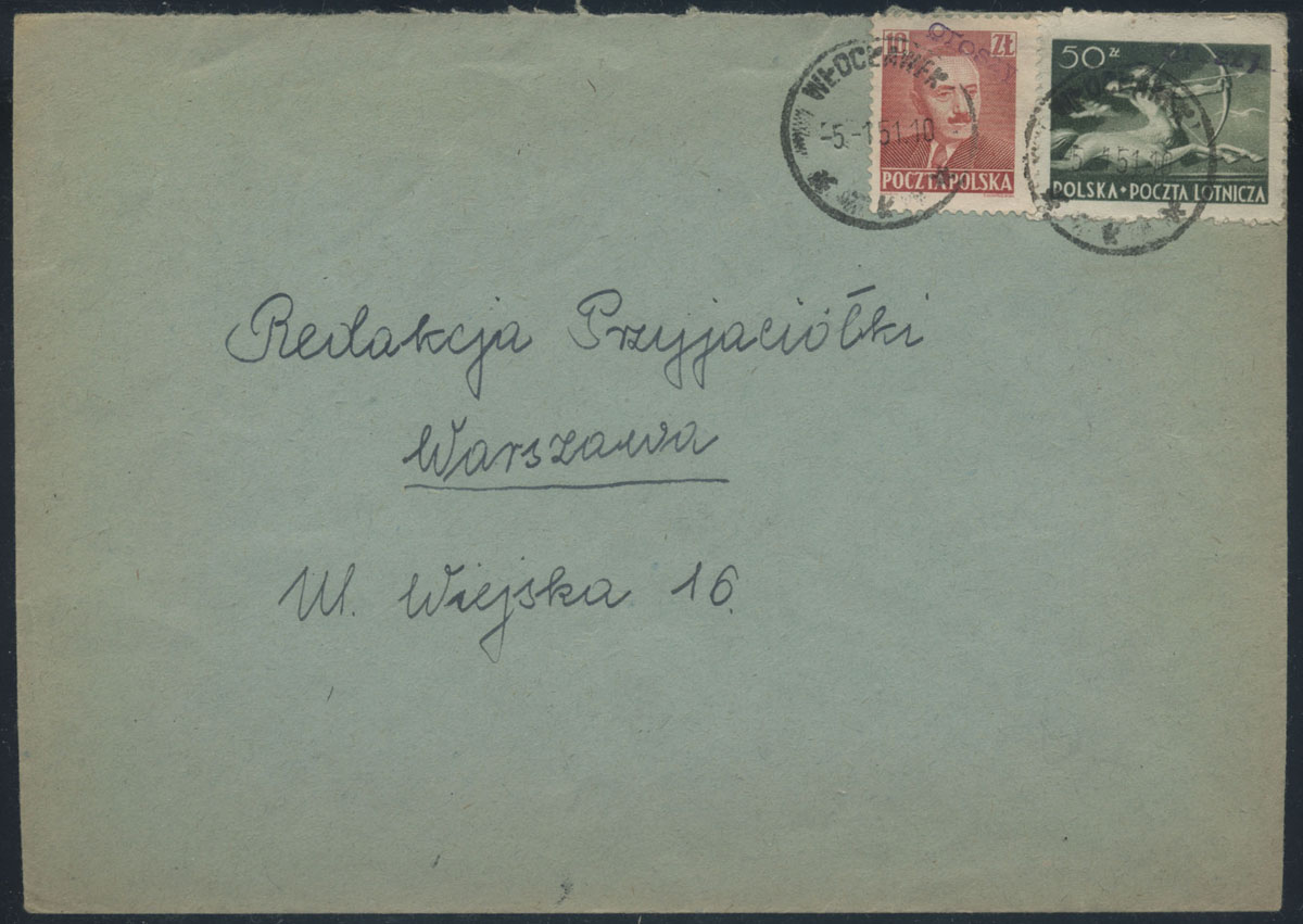 1951 groszy, list z Wrocławia 17 do Warszawy opłacony znaczkami z nadrukiem groszy typ 26 w barwie fioletowej. | Fi.398, 525 Mi.565, 657 |