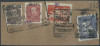 1951 groszy, list (duży fragment) z Sokołowa Podlaskiego do Warszawy opłacony znaczkami z nadrukiem groszy typ 23B w barwie czarnej. | Fi.449, 470, 476 Mi.590, 621, 627 |