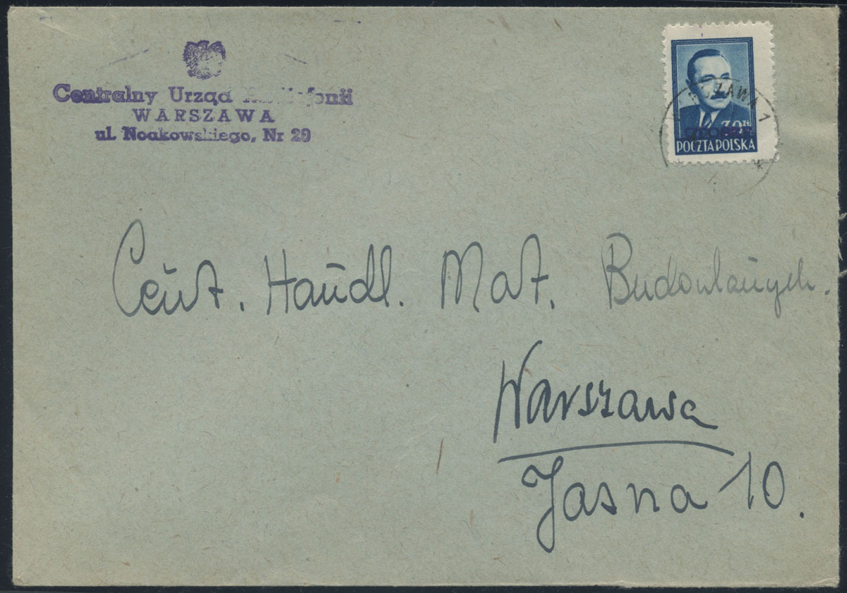1951 groszy, miejscowy list z Warszawy 27 opłacony znaczkiem z nadrukiem groszy typ 24 w barwie fioletowej. | Fi.475, 532 |