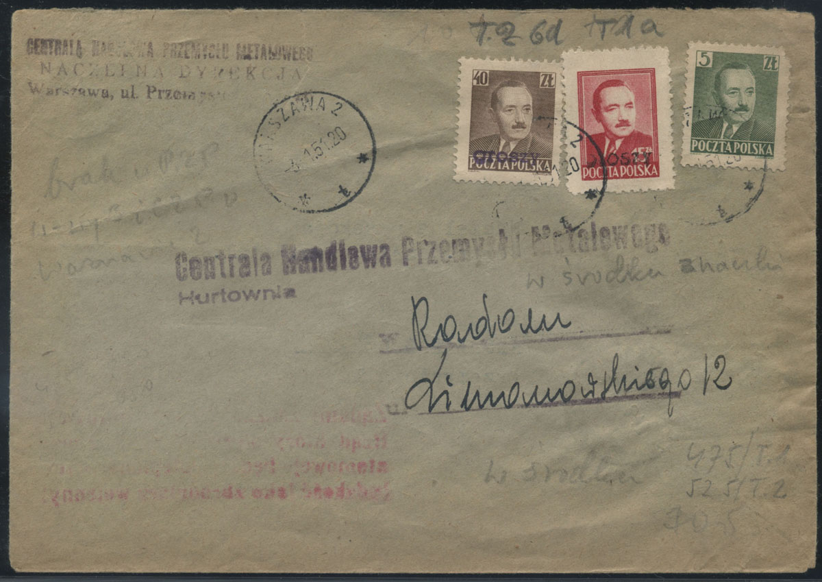1951 groszy, list firmowy z Warszawy do Radomia opłacony znaczkami z nadrukiem groszy typ 2 w barwie fioletowej i czarnej. | Fi.475, 519, 525 |