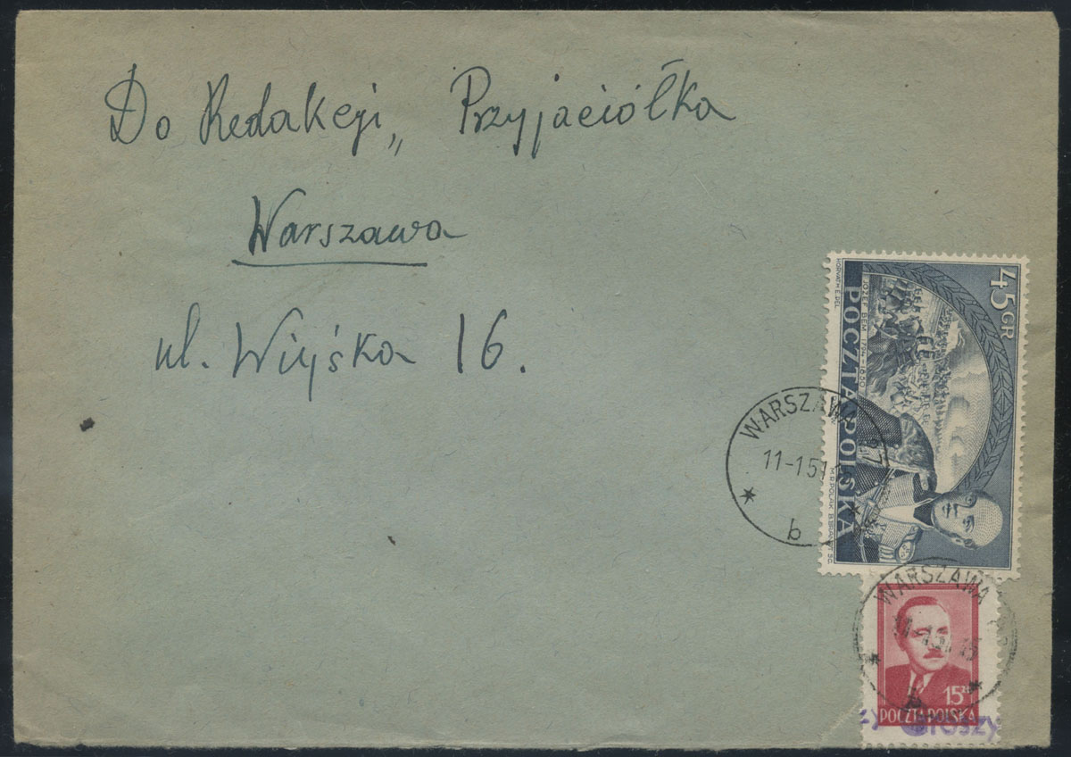 1951 groszy, list z Poznania do Warszawy opłacony znaczkiem z nadrukiem typ 12 w barwie fioletowej, trzy znaczki bez nadruku, znaczek za 15 zł w odmianie I i II. | Fi.475, 527I, II Mi.626, 665 |