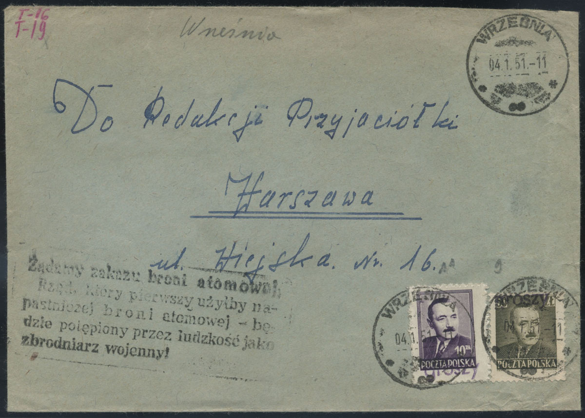 1951 groszy, list z Łodzi do Warszawy opłacony znaczkami z nadrukiem typ 5 w barwie fioletowej. | Fi.503 Mi.644 |