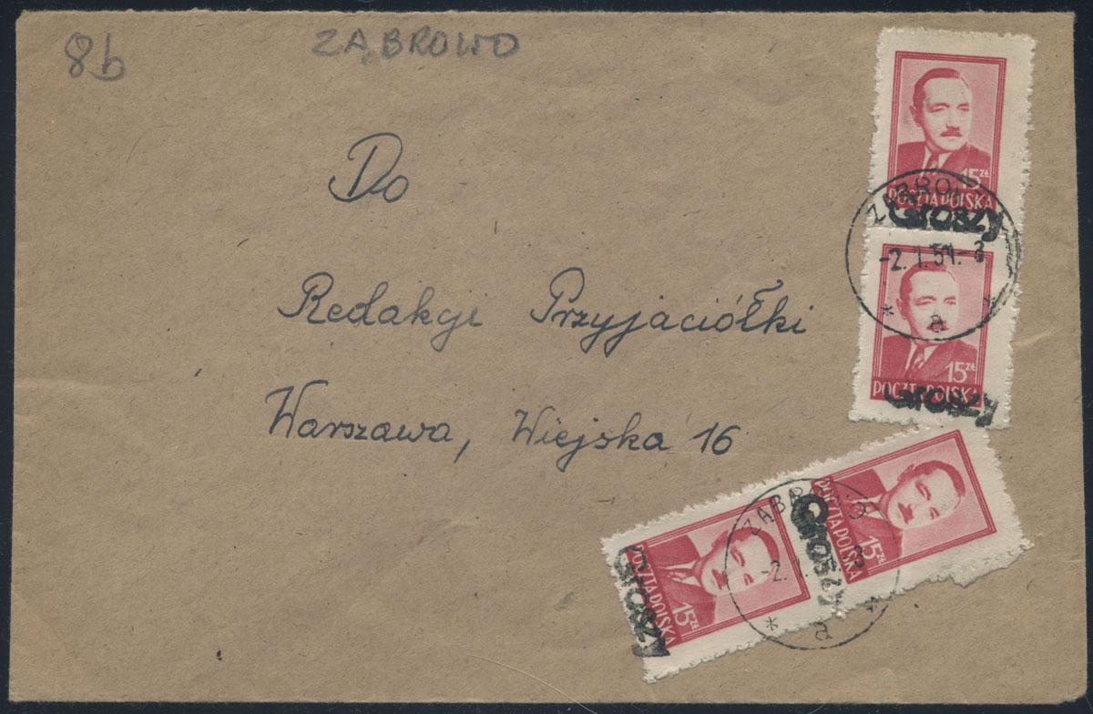 1951 groszy, list z Ząbrowa do Warszawy opłacony znaczkami z nadrukiem groszy typ 8 w barwie czarnej. | Fi.475 |