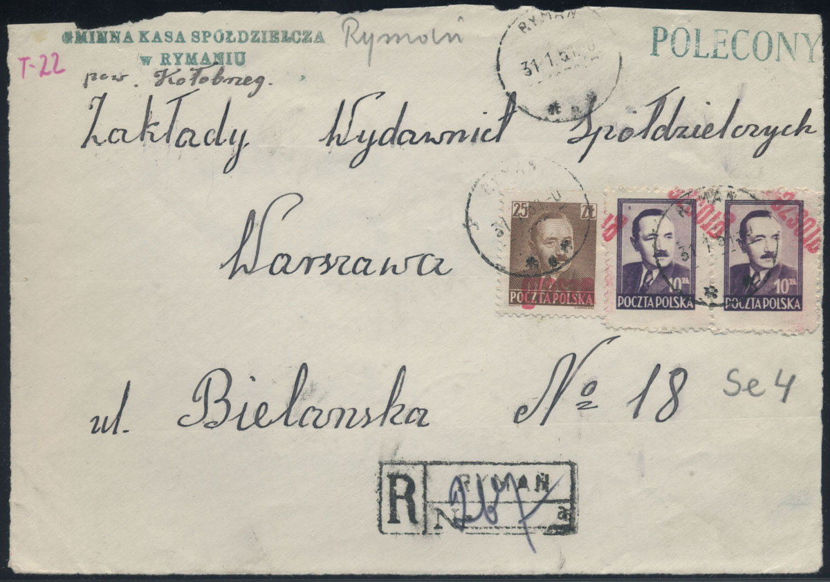1951 groszy, front listu poleconego z Rymań do Warszawy opłacony znaczkami z nadrukiem groszy typ 22 w barwie czerwonej. | Fi.474, 523 |